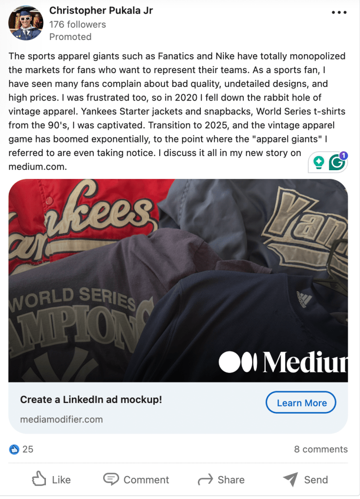 I like how he says if something makes you laugh or feels real while you’re writing it, put it in. I’ve noticed that’s when my writing feels strongest — when I’m not overthinking whether people will “get it” or if it sounds too casual. It’s the same thing I’ve noticed working on creative stuff like my Yankees instagram page. Whenever my buddy Brandon and I try too hard to post something we think people want to see, such as informative graphics with data, it usually falls flat. But when we post something that just feels natural, something we genuinely believe is incredible like a video from the stadium… that’s what people actually connect with. I see writing in the same kind of way.